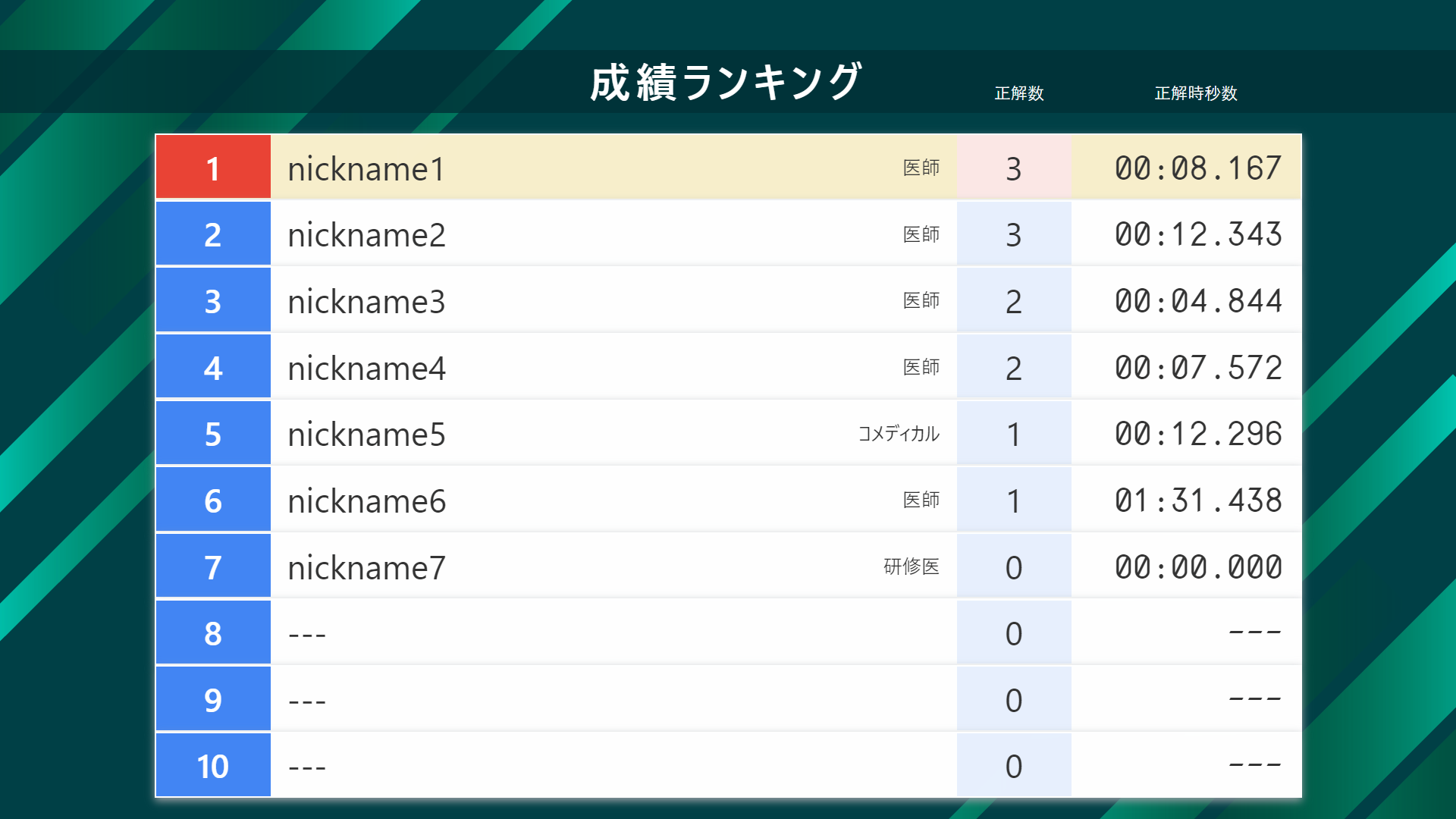 早押しランキングや、正答数と早押しの総合ランキングを表示できますので、会場を盛り上げられます。