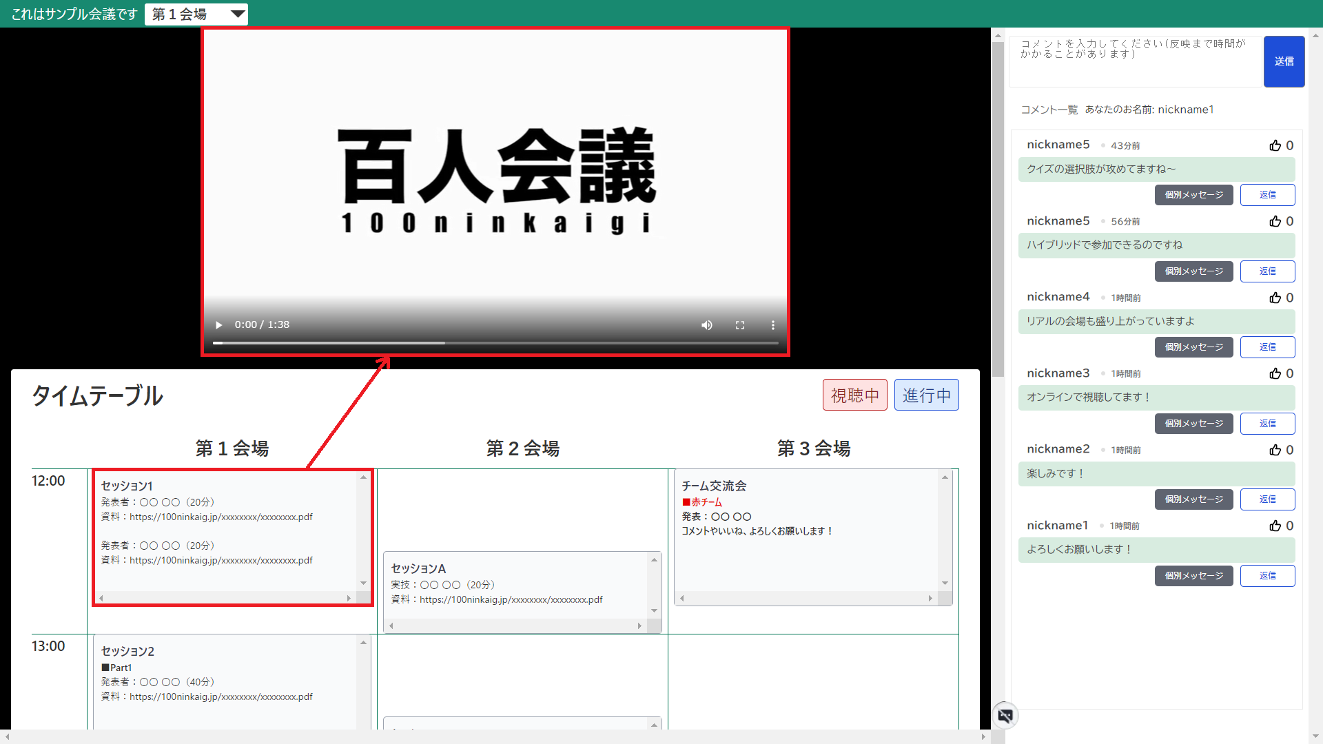 ブラウザでタイムテーブルからセッションを選択して会場の切り替えを行い、ライブ配信を視聴できます。