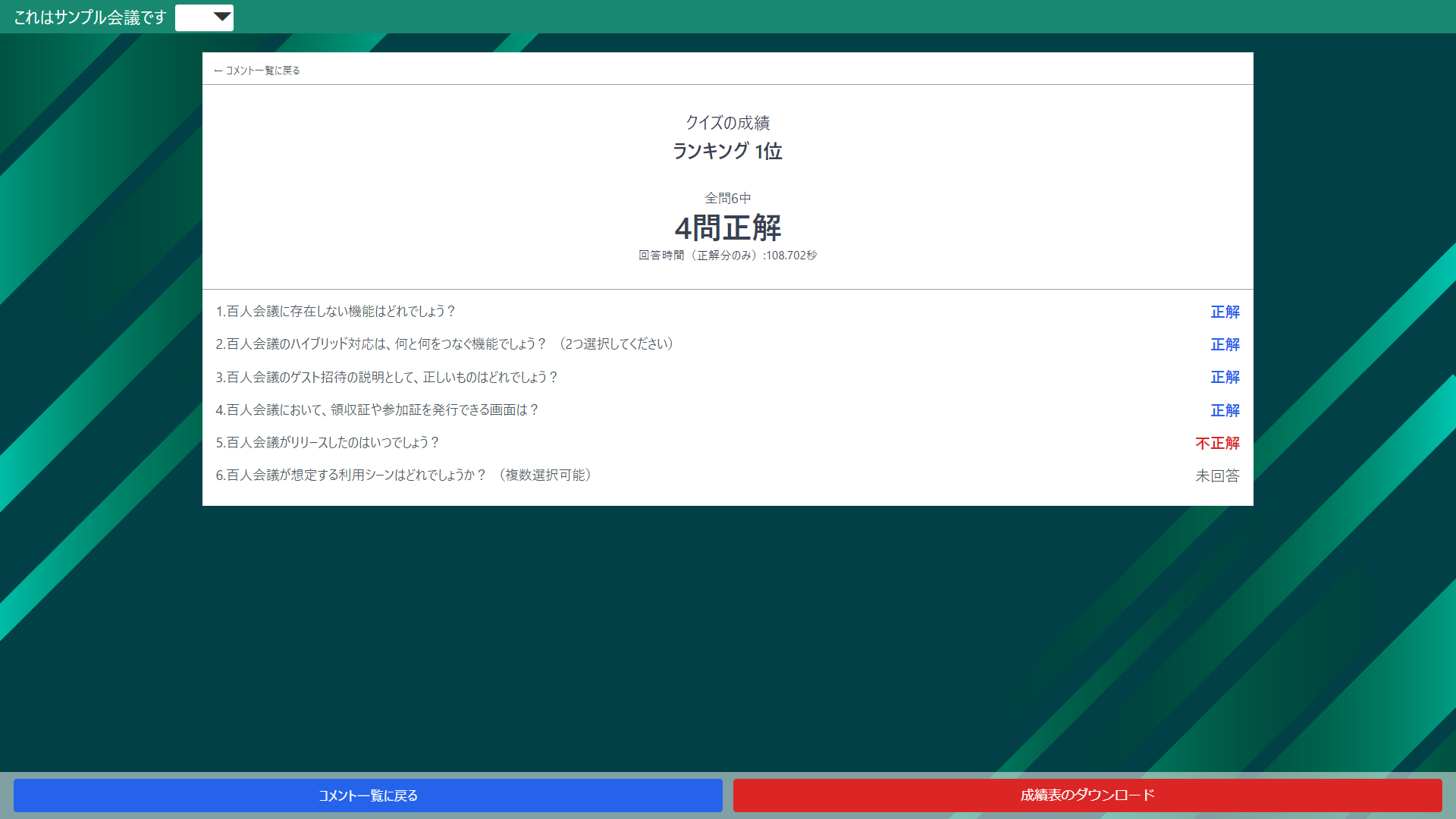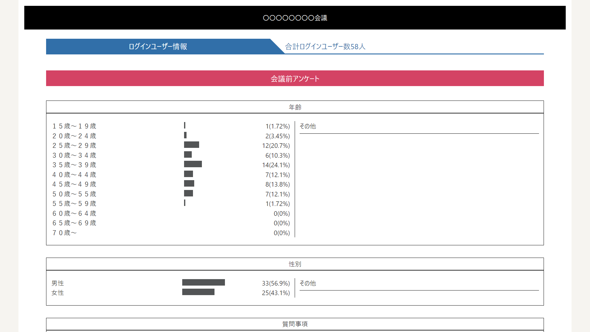 会議前アンケート、コメント、投票、クイズ、アンケートなどを画面やxlsxでまとめて出力でき会議後の振り返りにもご利用いただけます。