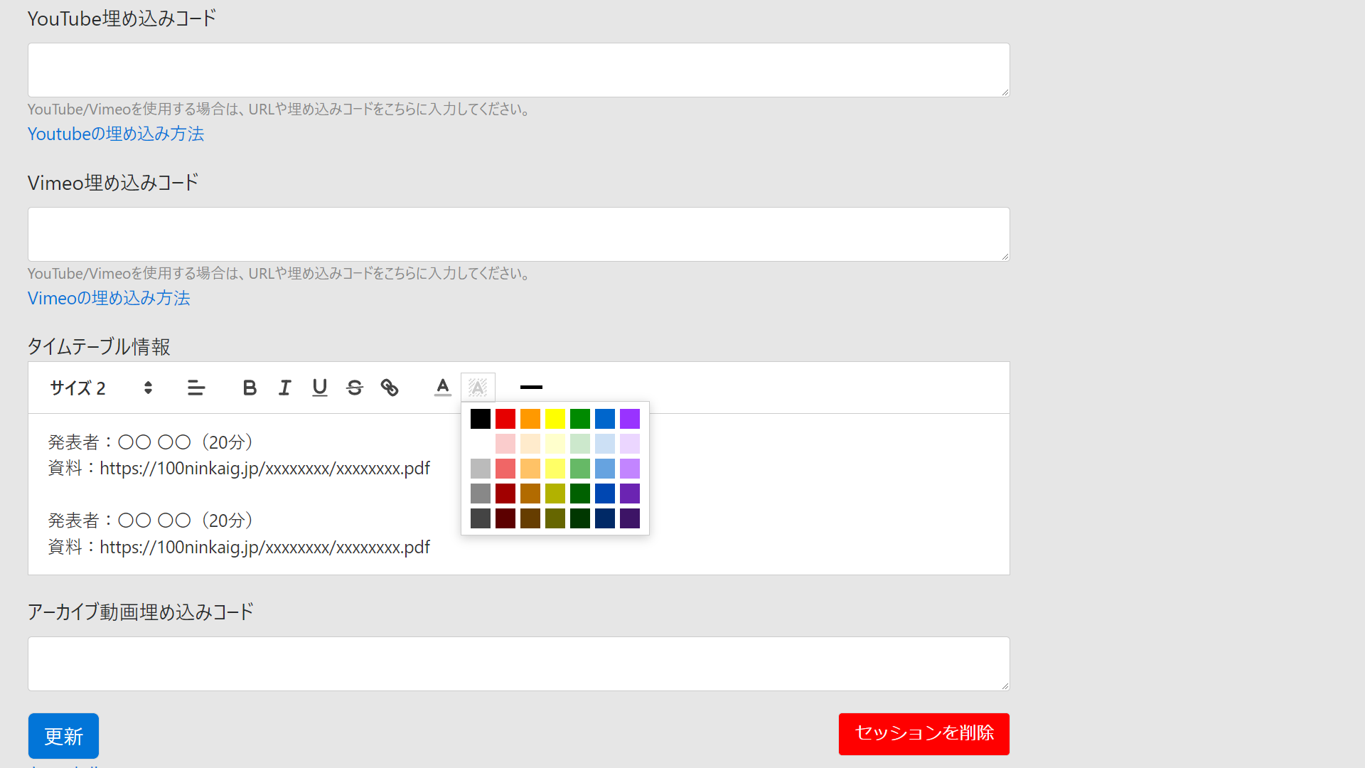 セッション毎に概要説明を記入できますので、参加者にセミナー資料などの配布ができます。